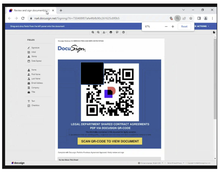 Upon clicking the link within the email, the user is directed to the legitimate DocuSign portal, where they can view and interact with the document. However, within the document is a seemingly harmless QR code that the user is prompted to scan.